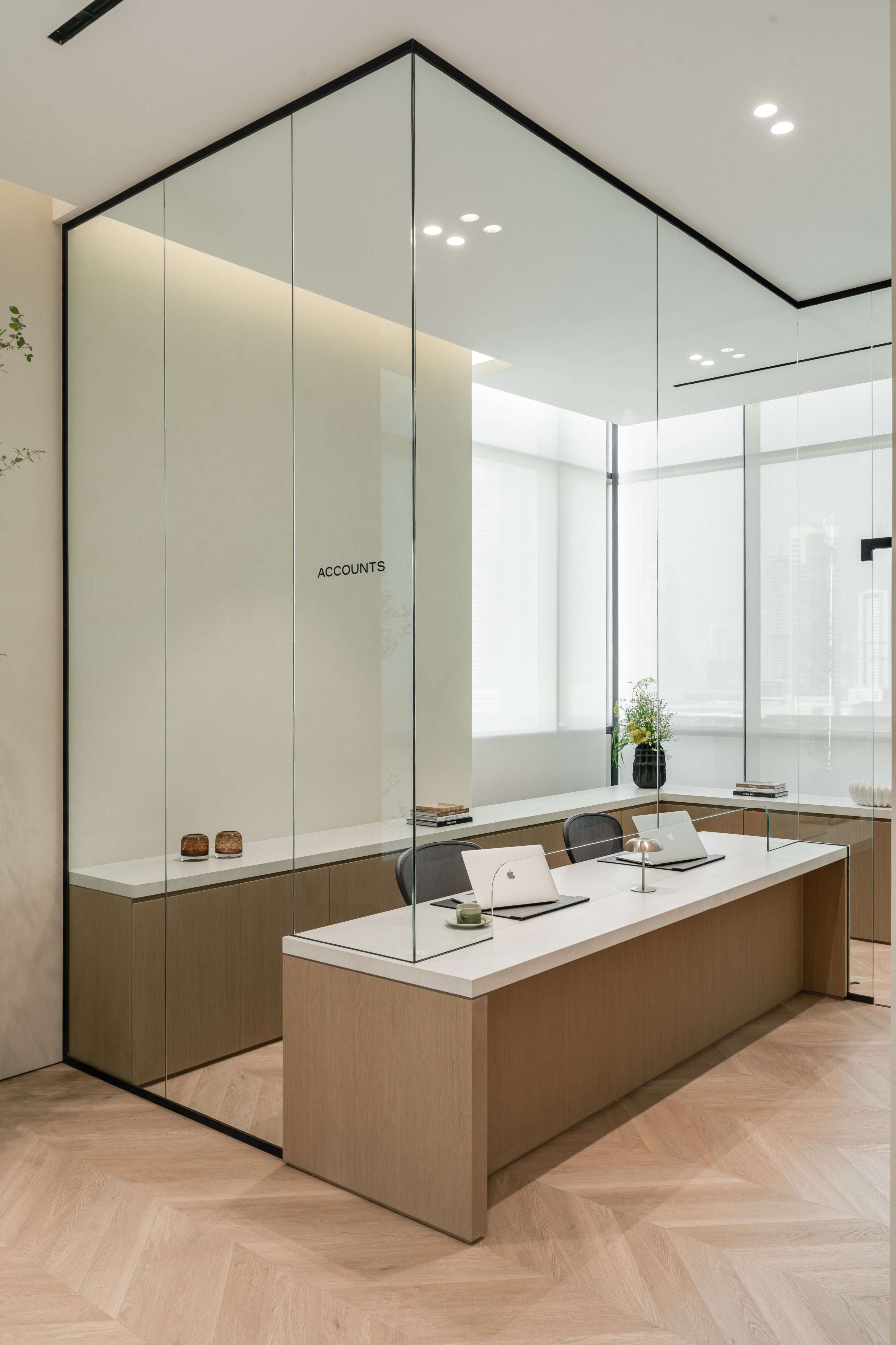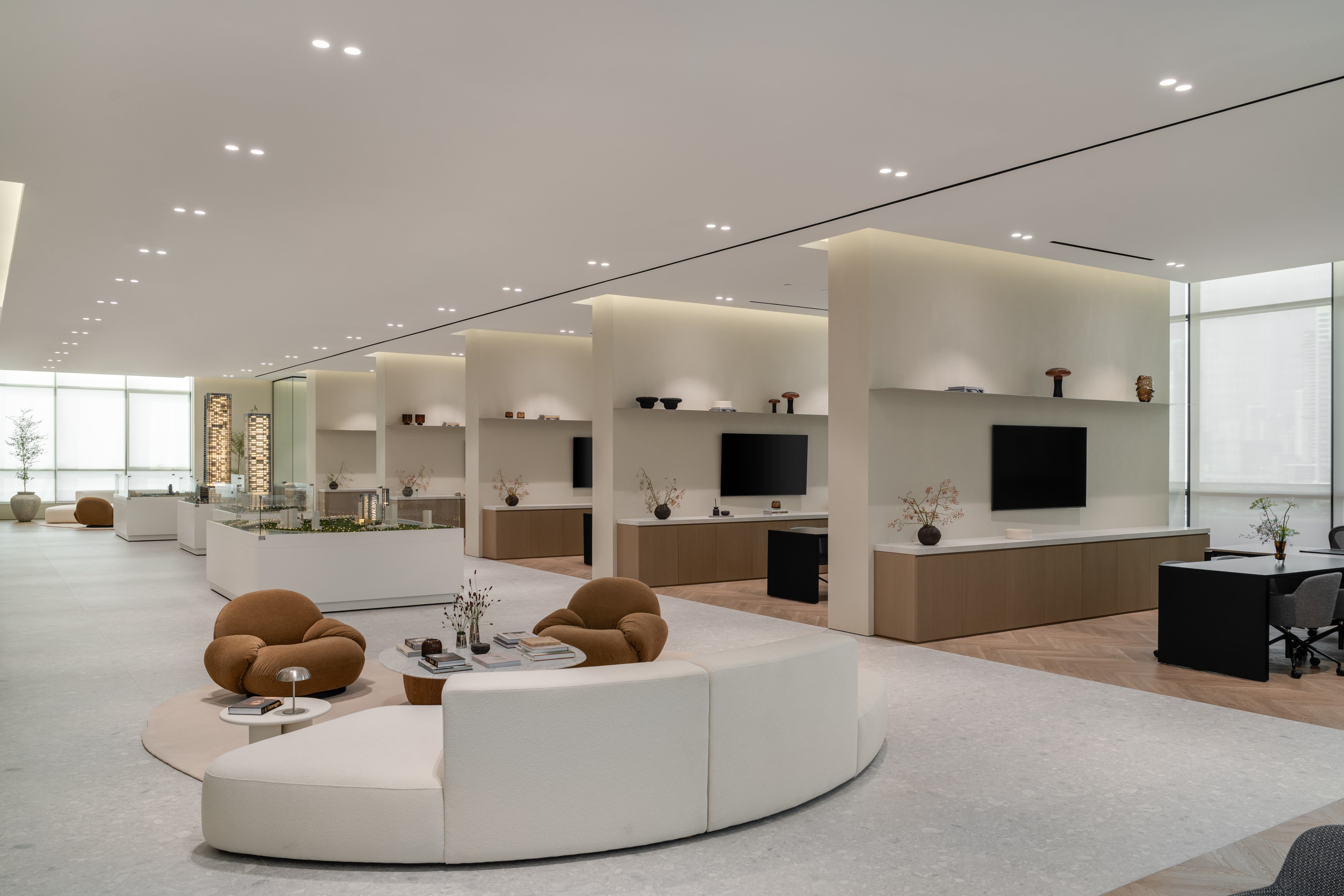 The open-plan workspace is a masterclass in modern interior design and office interior design, greeting guests and occupants alike with an air of simplicity and elegance. Every material, texture, and finish—down to the built-in connectivity ports—reflects our dedication to luxury modern design. Fluid workstations accommodate both focused heads-down tasks and collaborative brainstorming sessions. Discreetly integrated smart technology ensures seamless connectivity, while luxury home accessories and contemporary artwork punctuate the layout with curated pops of personality. This office is engineered for both style and efficiency.