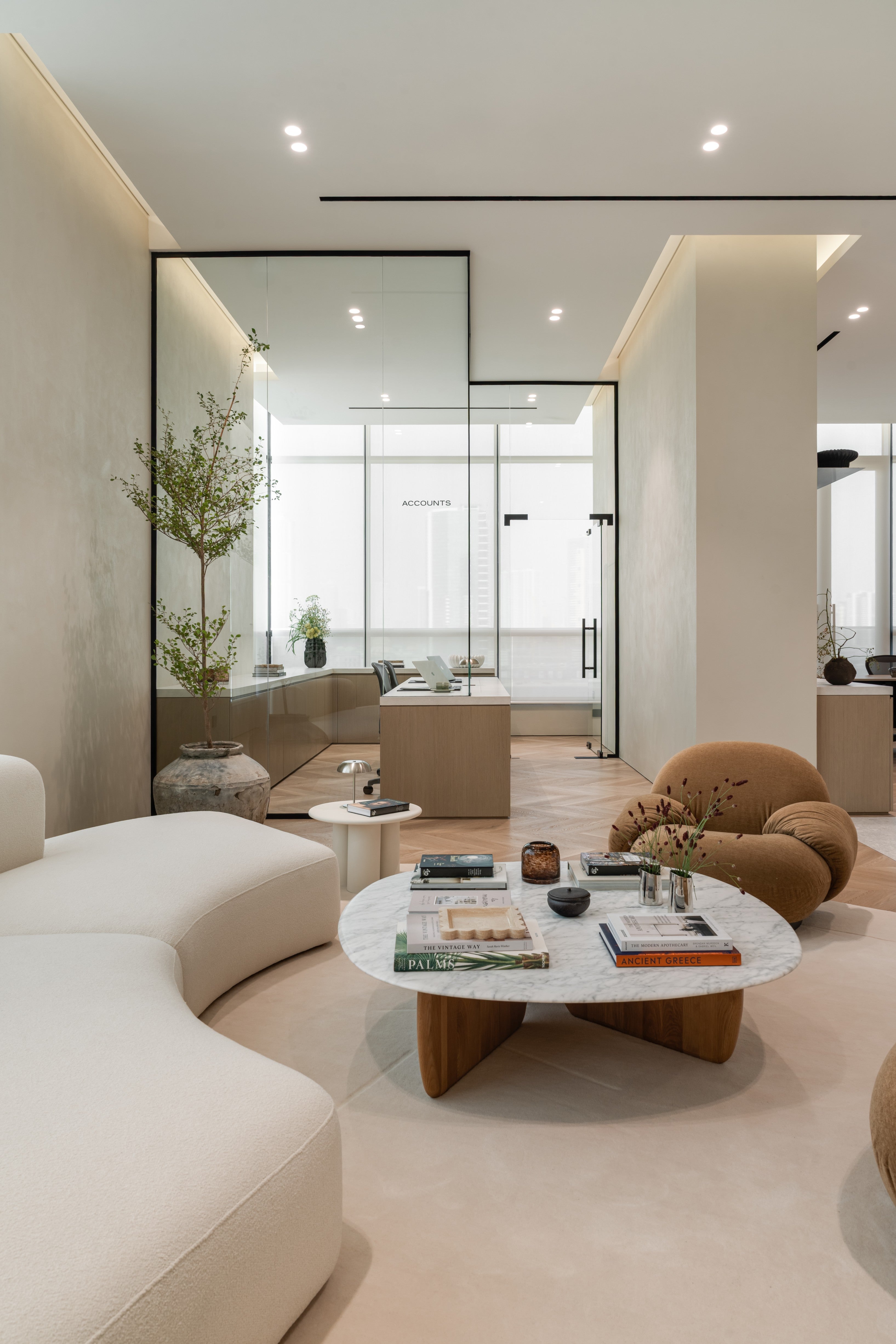 As the sales office for one of the leading real-estate companies in the UAE, this Sharjah office interior embodies a seamless workspace layout that balances open collaboration with intimate meeting nooks. The reception unfolds like a luxurious living room decor vignette: plush, tactile seating framed by high-gloss marble consoles, neutral palettes warmed by brushed brass accents, and artful wall decor ideas that captivate without overwhelming. Natural light pours through and floor-to-ceiling glazing frames panoramic waterfront vista, infusing the area with natural warmth and accentuating the subtle biophilic elements woven into the scheme, enriching the welcoming sense of arrival.