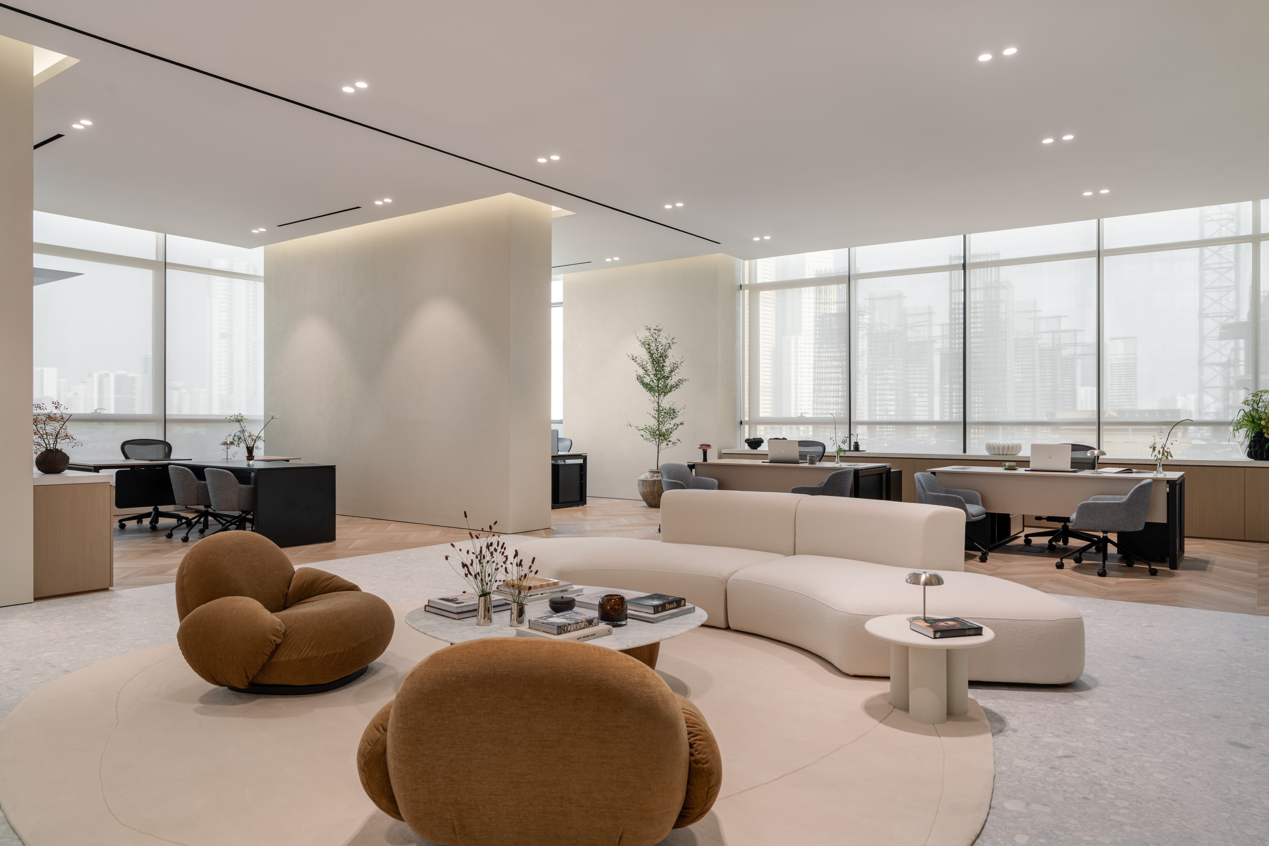 As the sales office for one of the leading real-estate companies in the UAE, this Sharjah office interior embodies a seamless workspace layout that balances open collaboration with intimate meeting nooks. The reception unfolds like a luxurious living room decor vignette: plush, tactile seating framed by high-gloss marble consoles, neutral palettes warmed by brushed brass accents, and artful wall decor ideas that captivate without overwhelming. Natural light pours through and floor-to-ceiling glazing frames panoramic waterfront vista, infusing the area with natural warmth and accentuating the subtle biophilic elements woven into the scheme, enriching the welcoming sense of arrival.