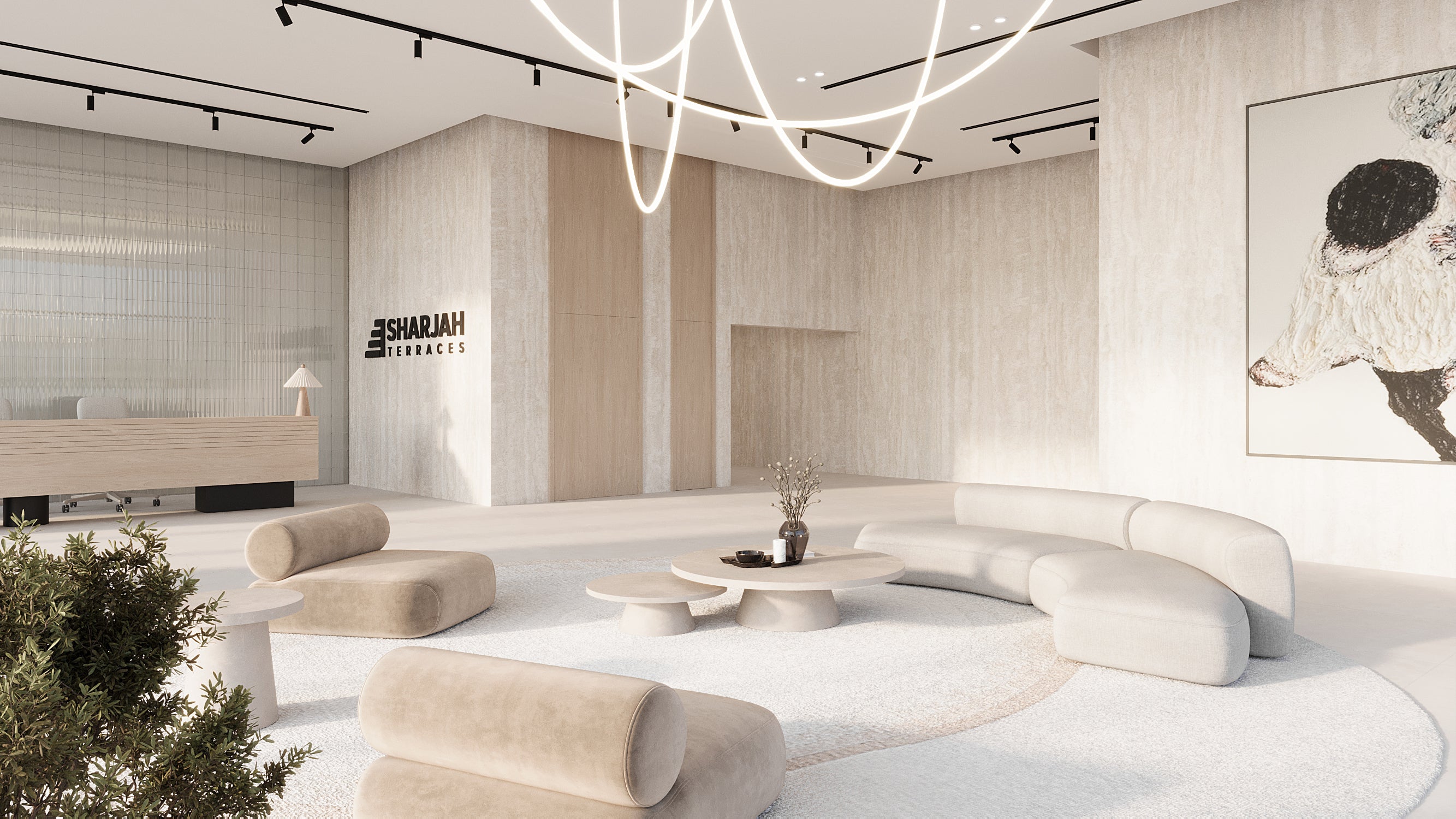The transition between the structured reception area and the relaxed lounge is seamless, creating a cohesive and well-defined experience. Every detail, from the strategically placed greenery to the carefully chosen artwork, has been considered to create a harmonious and inviting environment. The result is a lobby that is both visually striking and inherently welcoming, setting the tone for the entire Sharjah Terraces Tower experience.