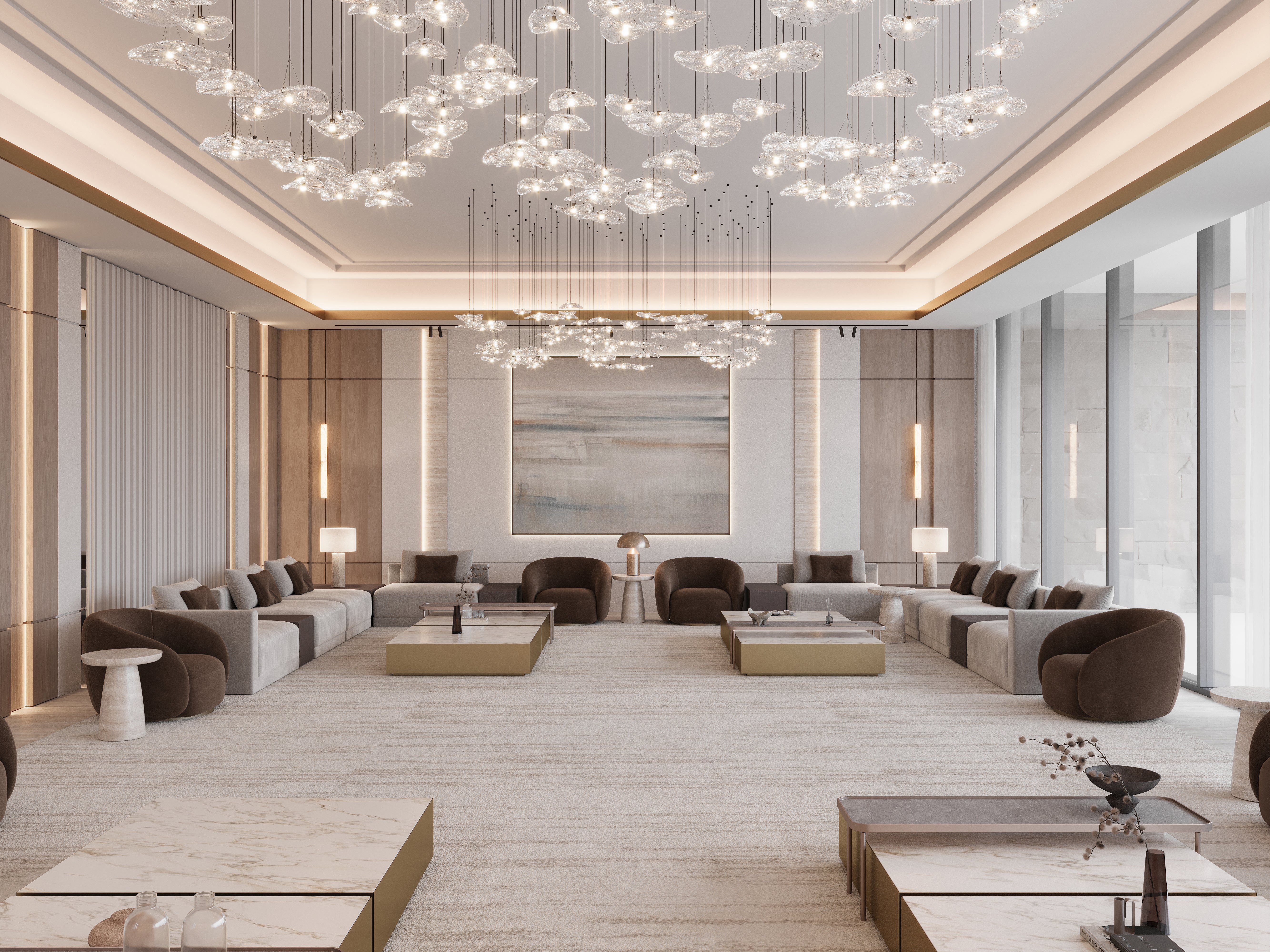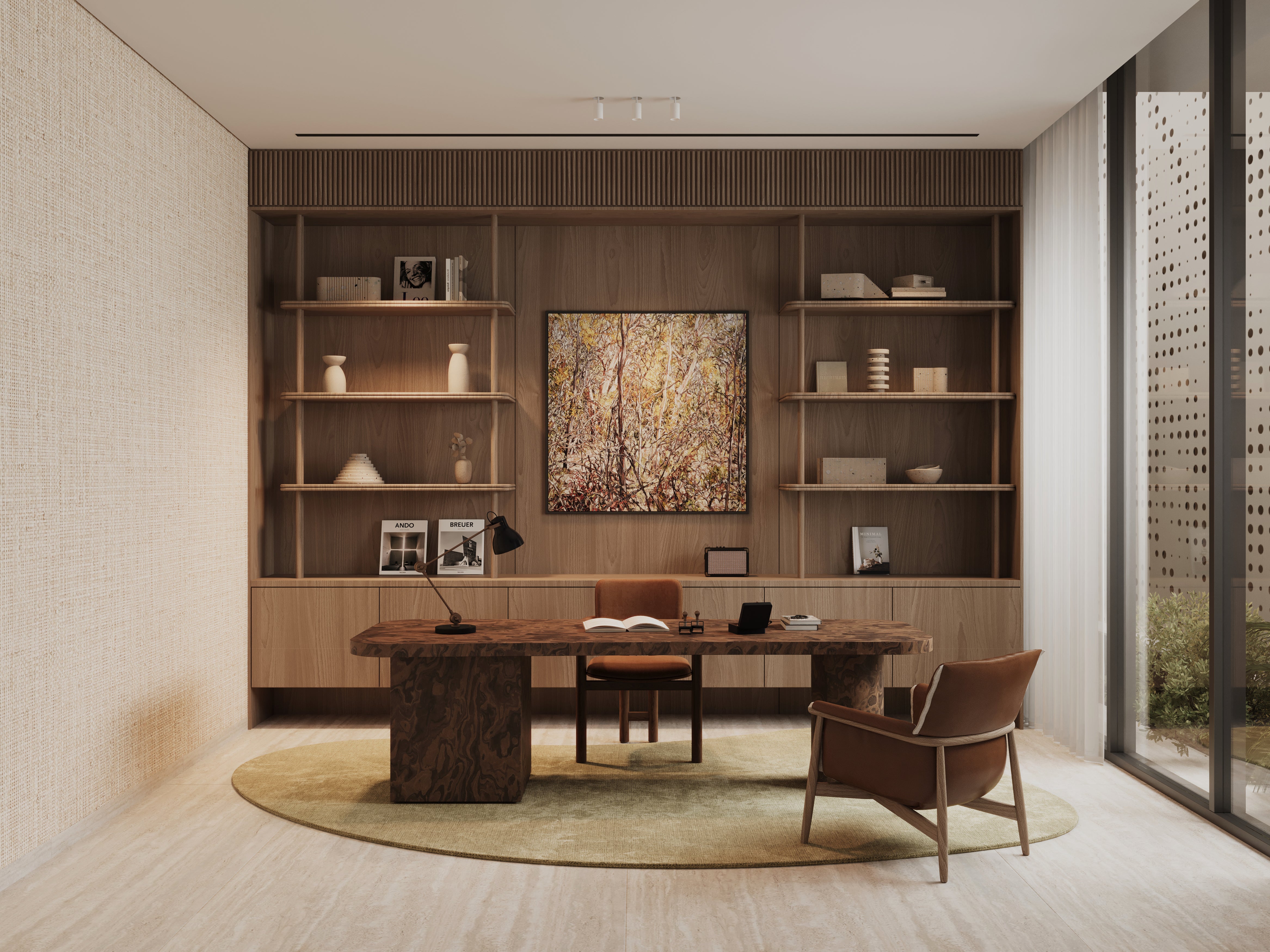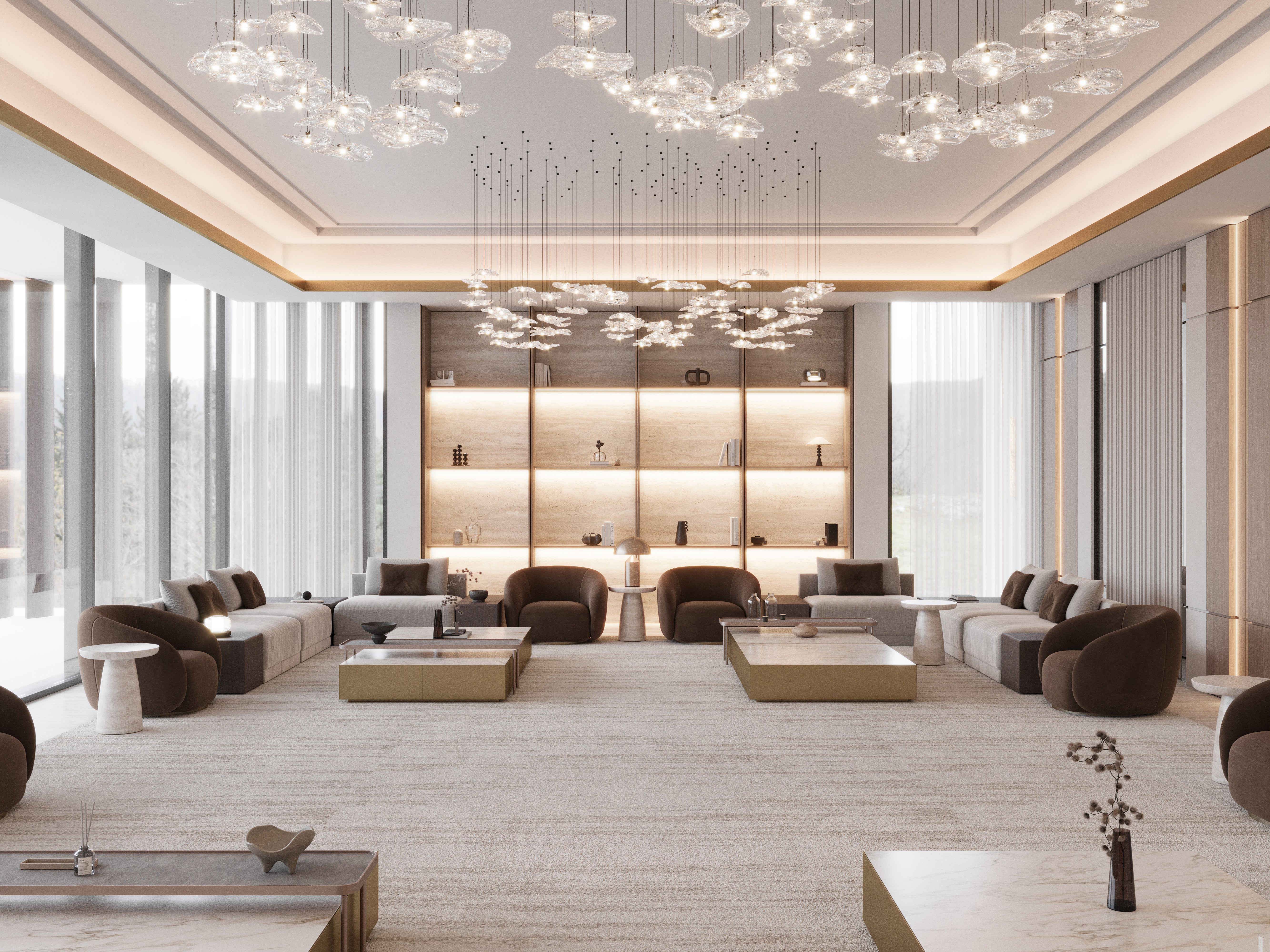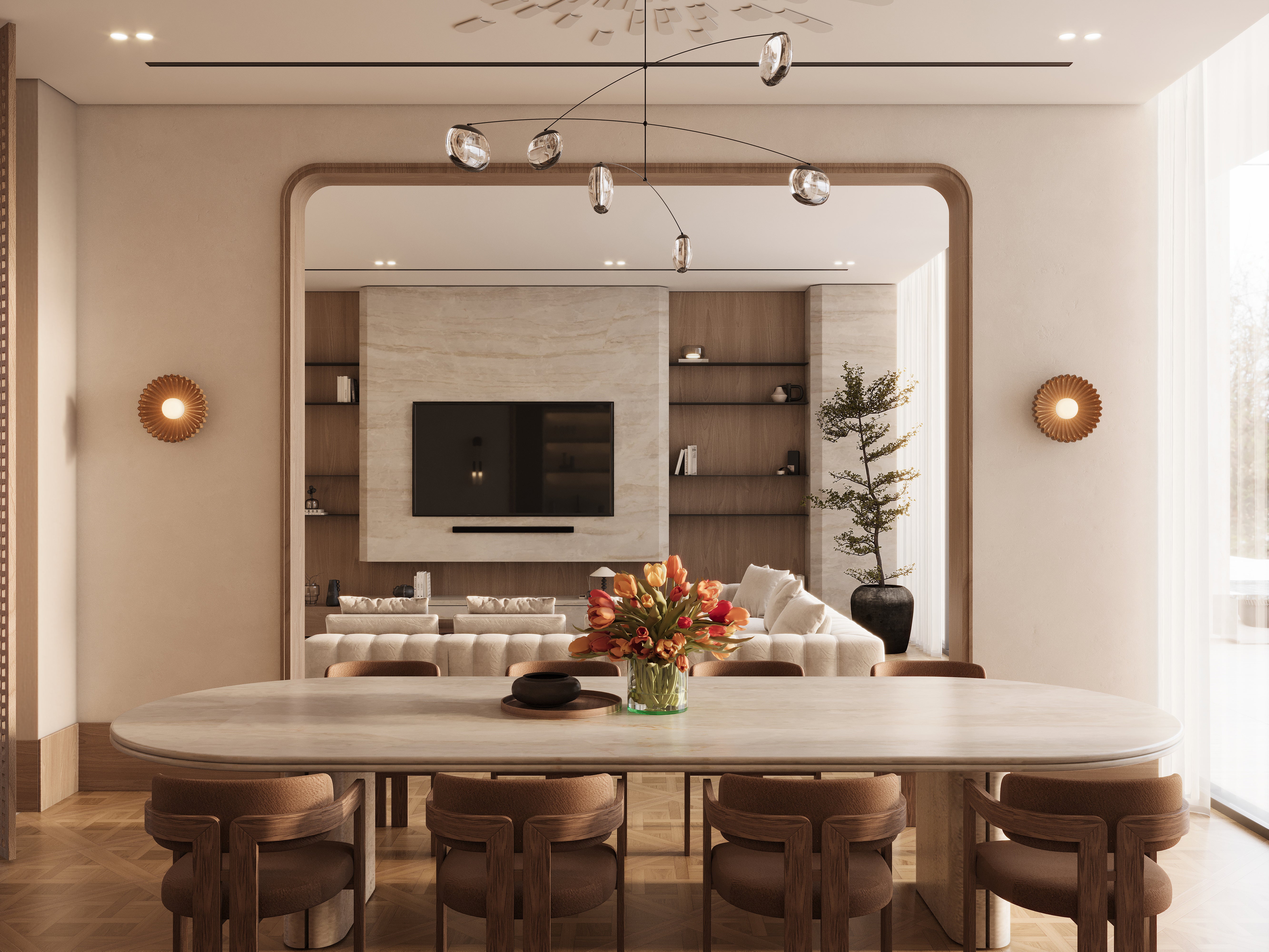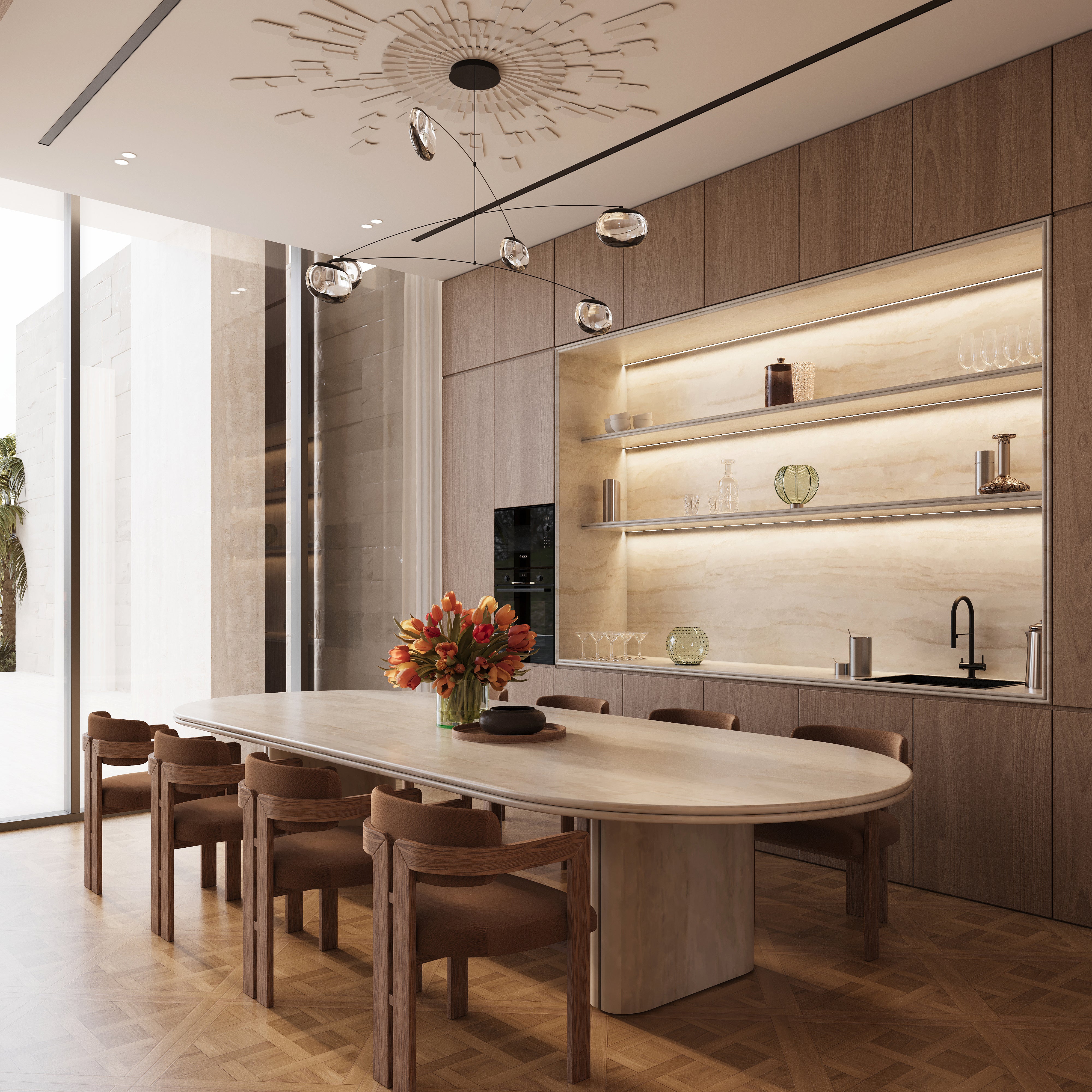 Social spaces such as the majlis, living, and dining rooms express understated grandeur. Expansive volumes are balanced with a restrained palette, where natural stone meets rich wood paneling, complemented by sculptural furniture and bespoke lighting. These areas are designed as settings for both gatherings and reflection, achieving harmony between openness and intimacy.