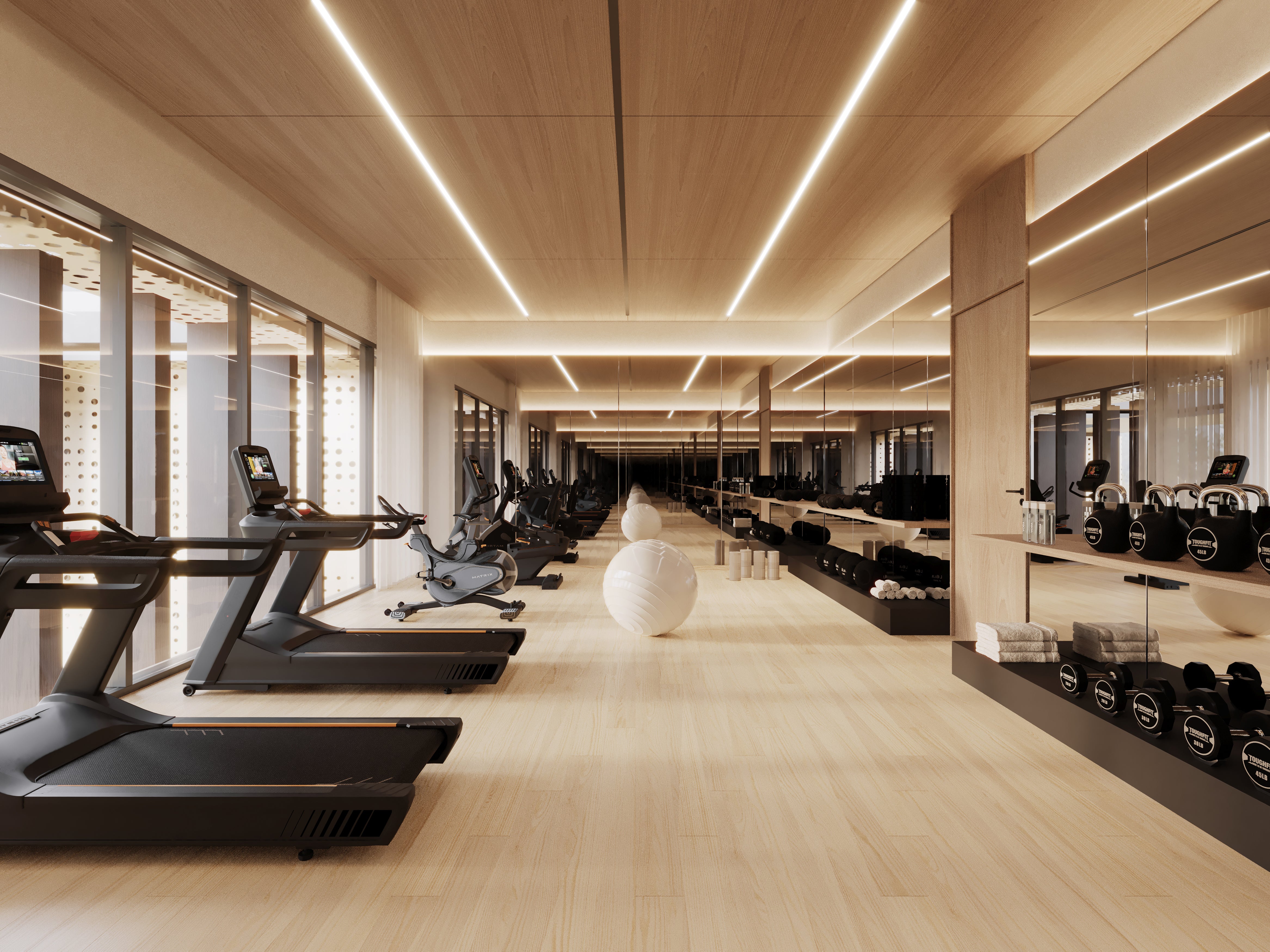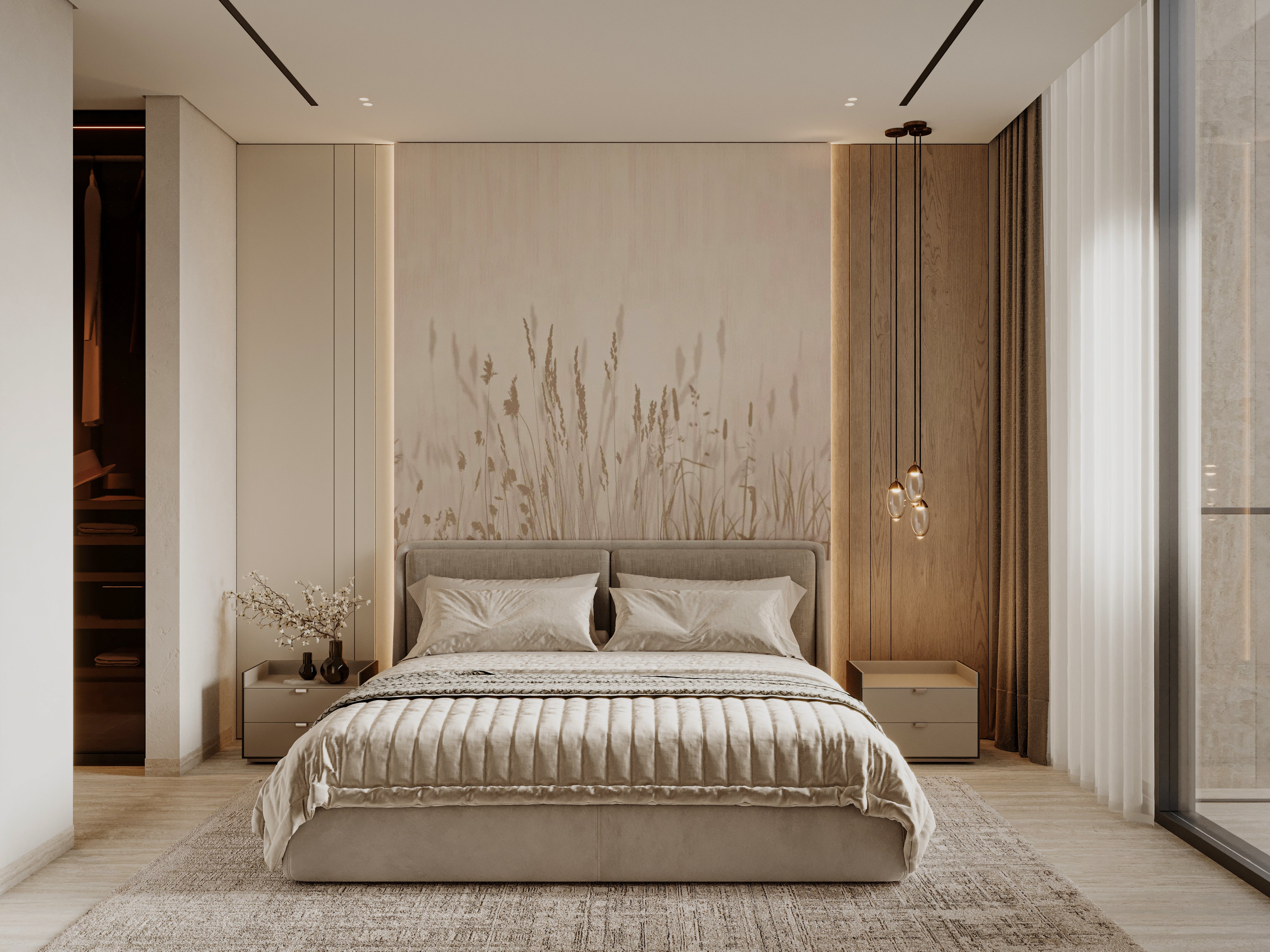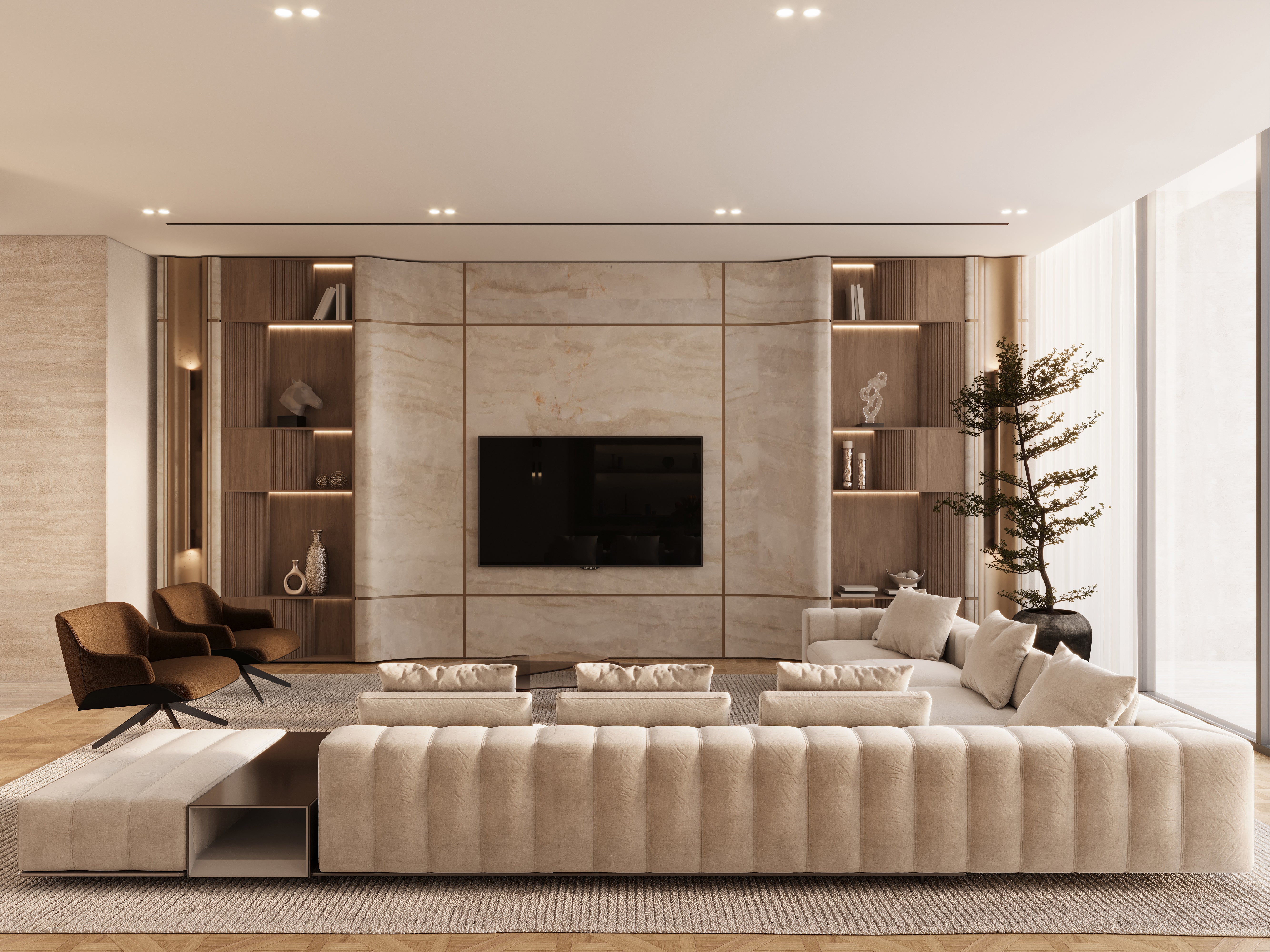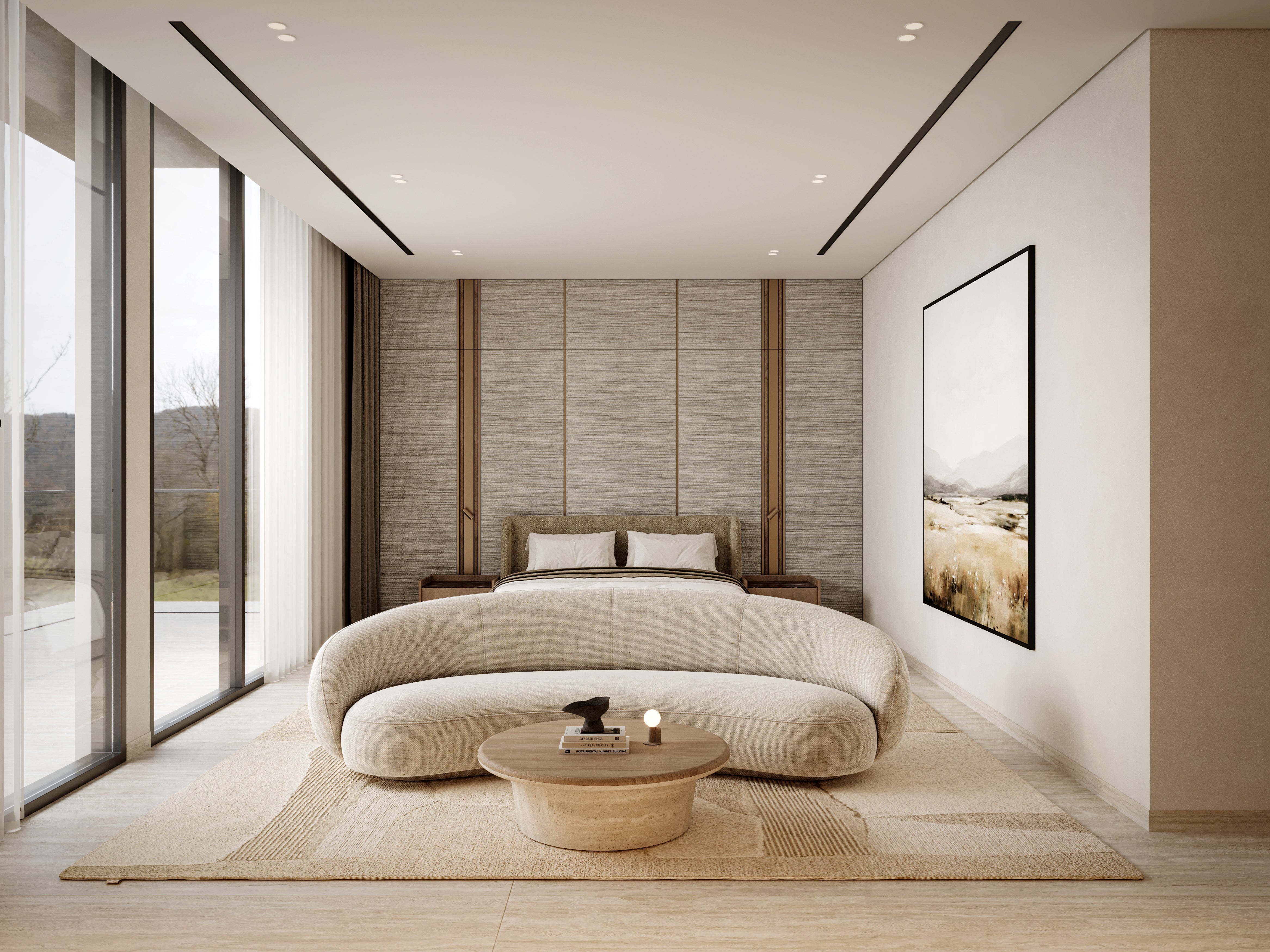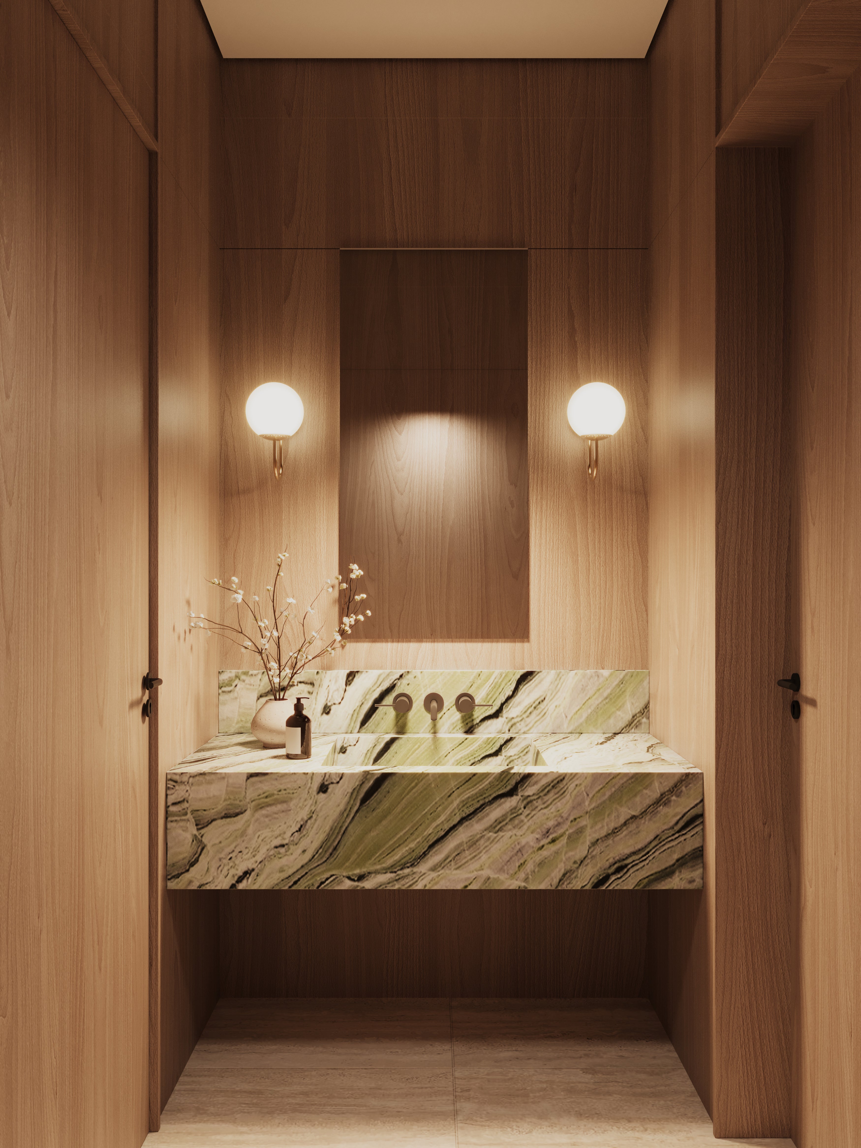 Private zones continue this language with a more personal atmosphere. Bedrooms are defined by layered textures, natural light, and the warmth of parquet flooring, while bathrooms and lounges are elevated by carefully selected marbles that introduce elegance without excess. Even in spaces designed for wellness and leisure, the materiality reinforces a sense of calm sophistication.