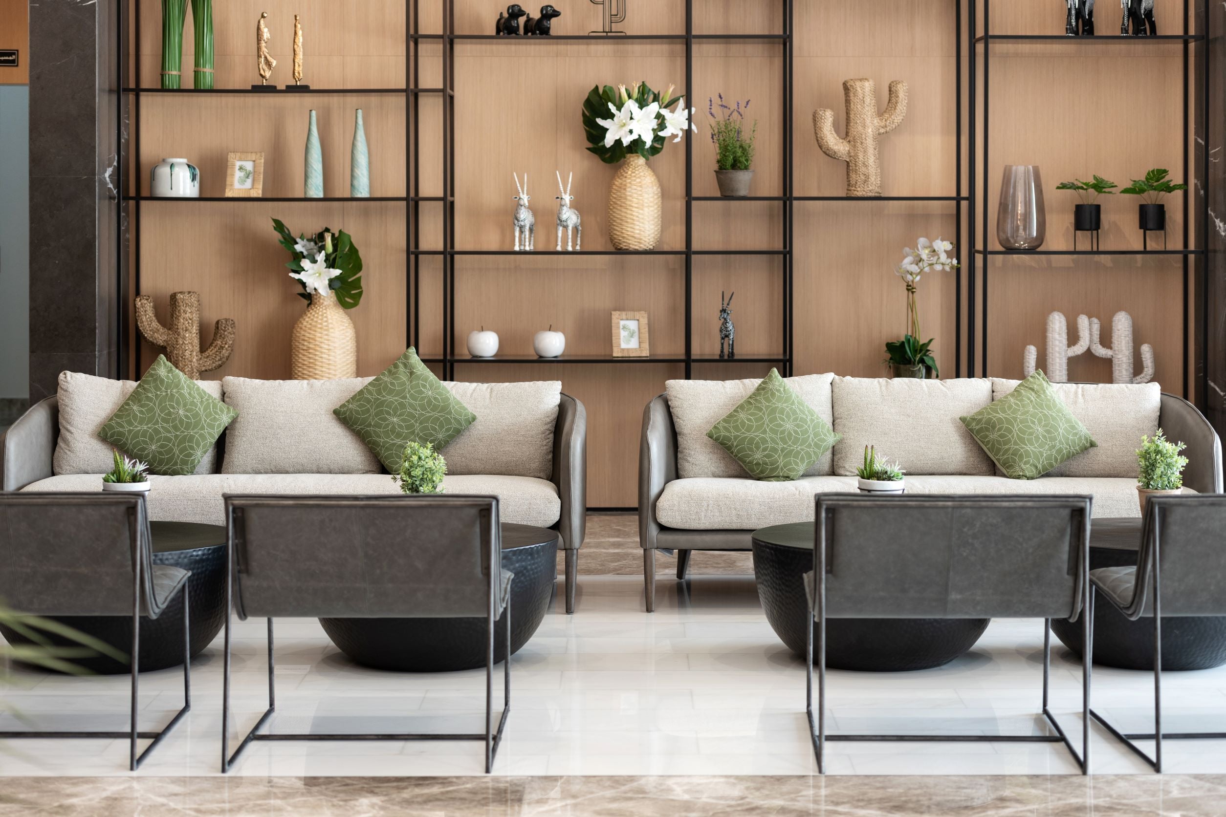 Accessories add splashes of color, and plants bring a bit of nature inside, making the lobby feel fresh and welcoming. The furniture in the seating area is both stylish and comfy, inviting people to sit back and relax. Black tables add a modern touch, and the lighting—from ceiling spots to designer lamps—gives off a warm, welcoming light.