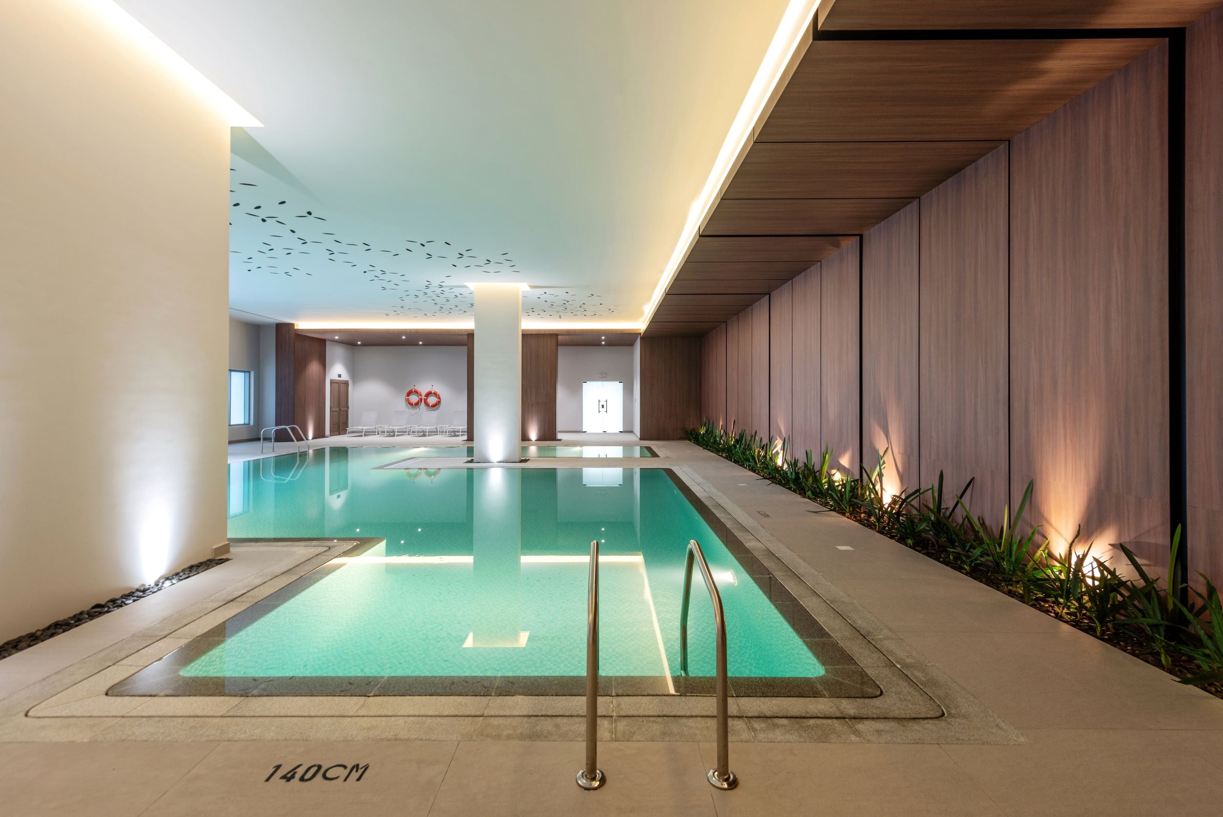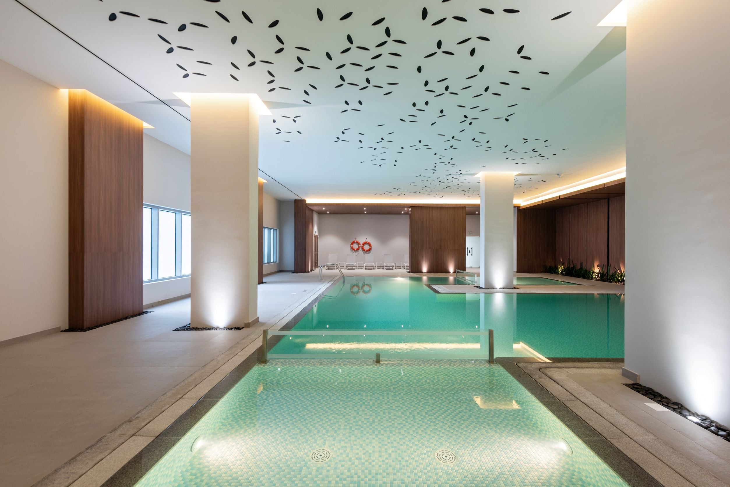 The swimming pool area is a calm spot meant for unwinding. Surrounded by simple yet stylish chairs, the blue pool invites you to take a break and enjoy some quiet. Above, metal bird sculptures give the feeling of movement and freedom. The wood paneling around the pool adds warmth, balancing the cool water. Lights tucked into the woodwork and walls create a soft, relaxing glow, while plants around the area bring a touch of green, making it a perfect place to relax.