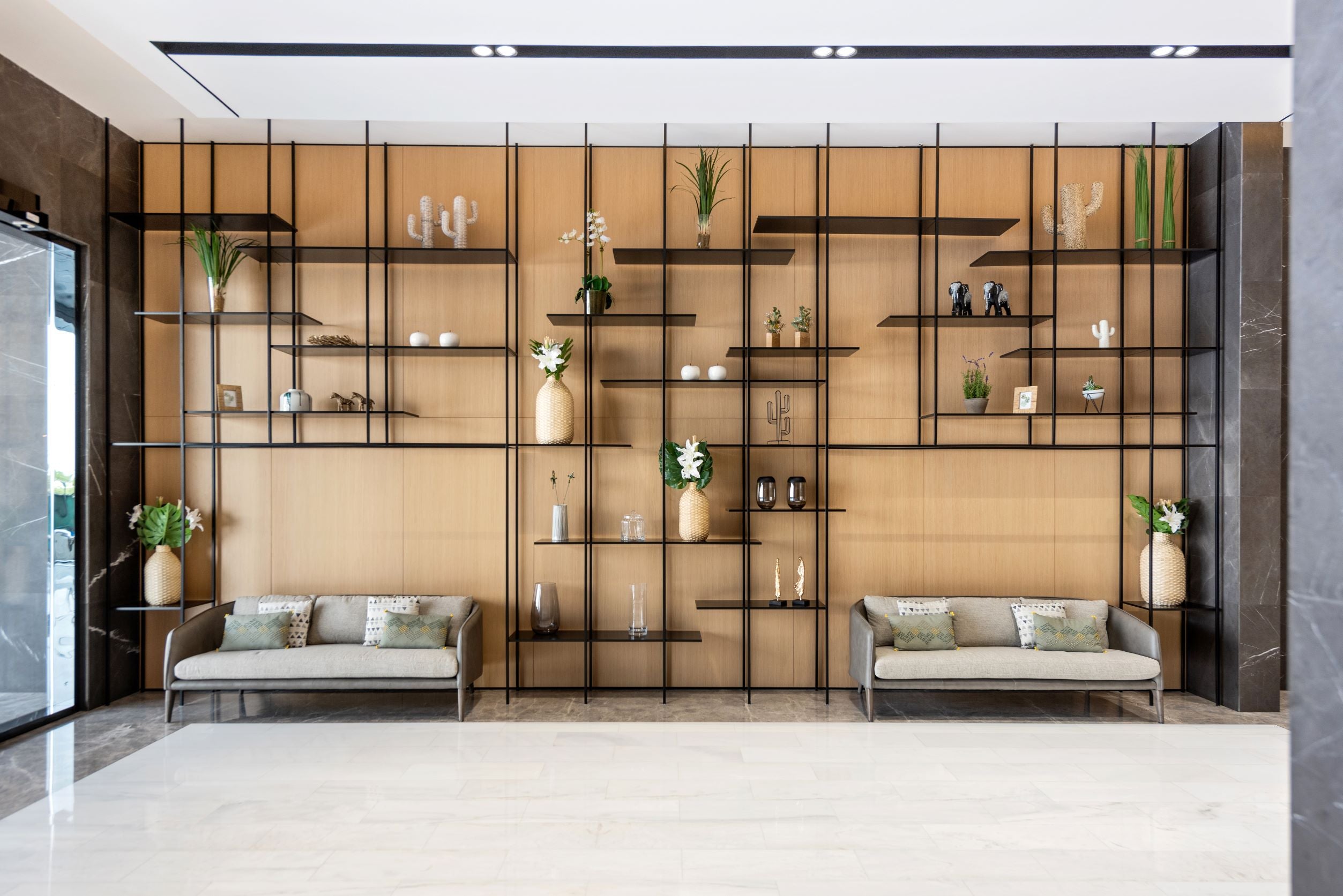 The lobbies of the towers are masterclass's in blending textures and materials to create a welcoming yet opulent space. The marble floor lights up the room, leading your eyes to a dark marble wall that makes a statement behind the reception desk. The desk is not just a functional space; it's a piece of art, made of white marble with streaks that add a touch of elegance. Wooden slats on the walls and ceiling wrap the room in a cozy feel, with patterns that catch your eye and make the space feel continuous.