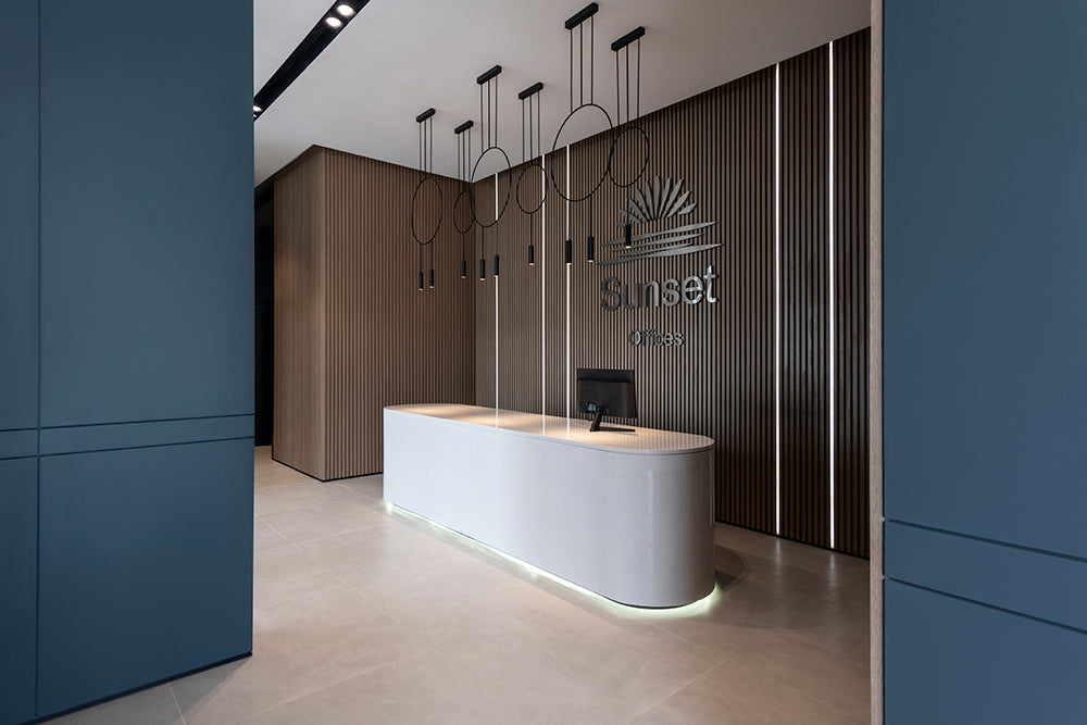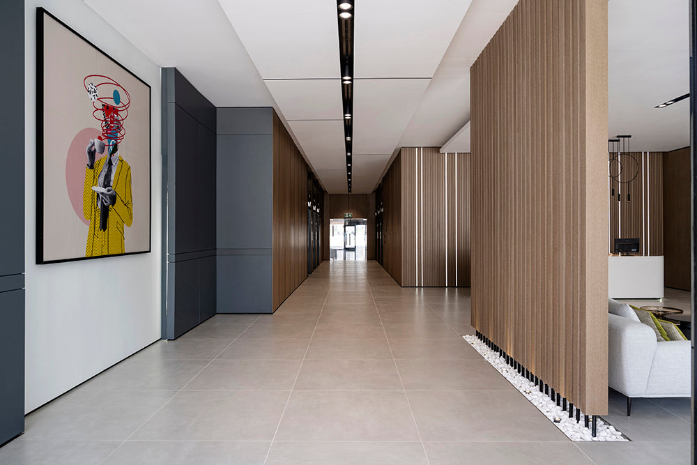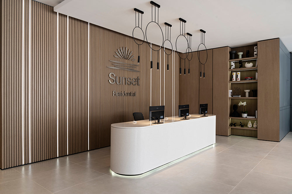 As residents step through the doors, they are greeted by a palette of soft neutrals complemented by warm wooden tones that line the walls. It’s an inviting contrast that sets the stage for a relaxing homecoming. The reception area, a sleek white desk backlit with soft lighting, stands as a modernist centerpiece, promising attentive service and a personal touch.