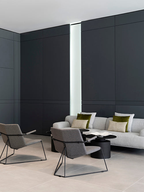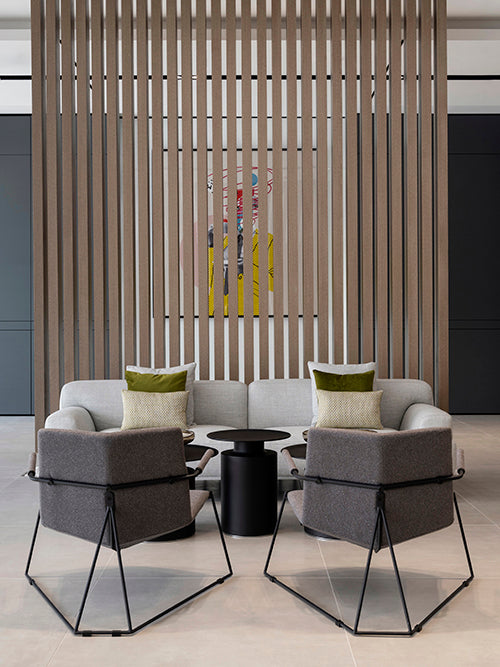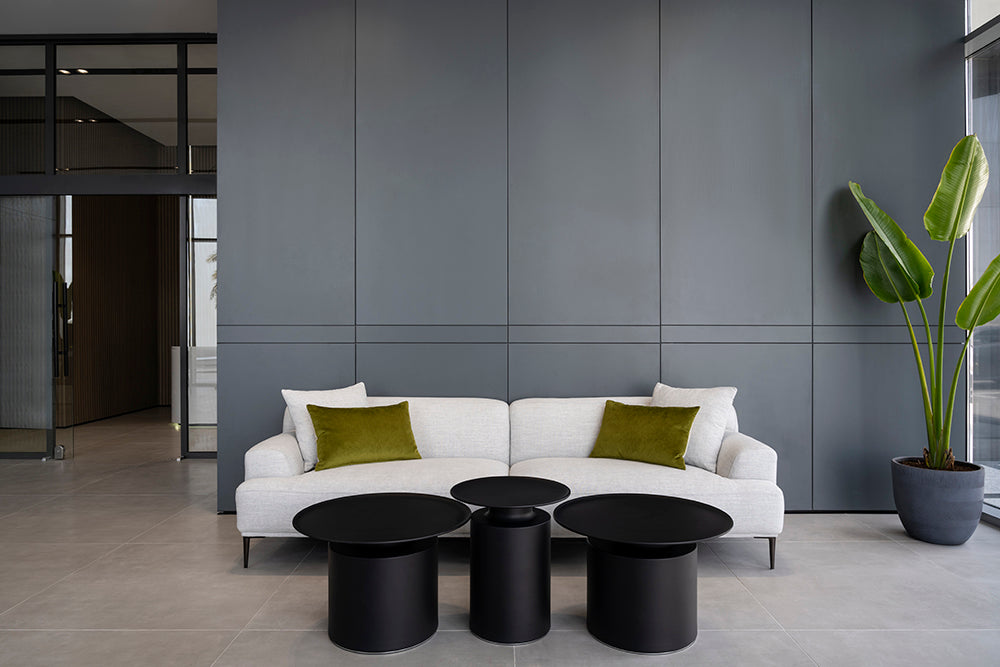 The seating area redefines modern comfort with plush sofas accented by pillows in hues of sage and charcoal, while the geometric lines of the armchairs add a contemporary edge. Positioned around elegant, circular coffee tables, this arrangement invites conviviality and rest.